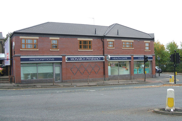 Fotografie + English: Monarch Pharmacy, Radford Road Now occupying the whole of this newly-built premises, Monarch Pharmacy originally occupied the right corner of the previous building before expanding. Other businesses in the building previously on this site included a veterinary practice (now a few doors further along Radford Road), a wool & crafts shop and a refrigerator/freezer retailer & repairer.