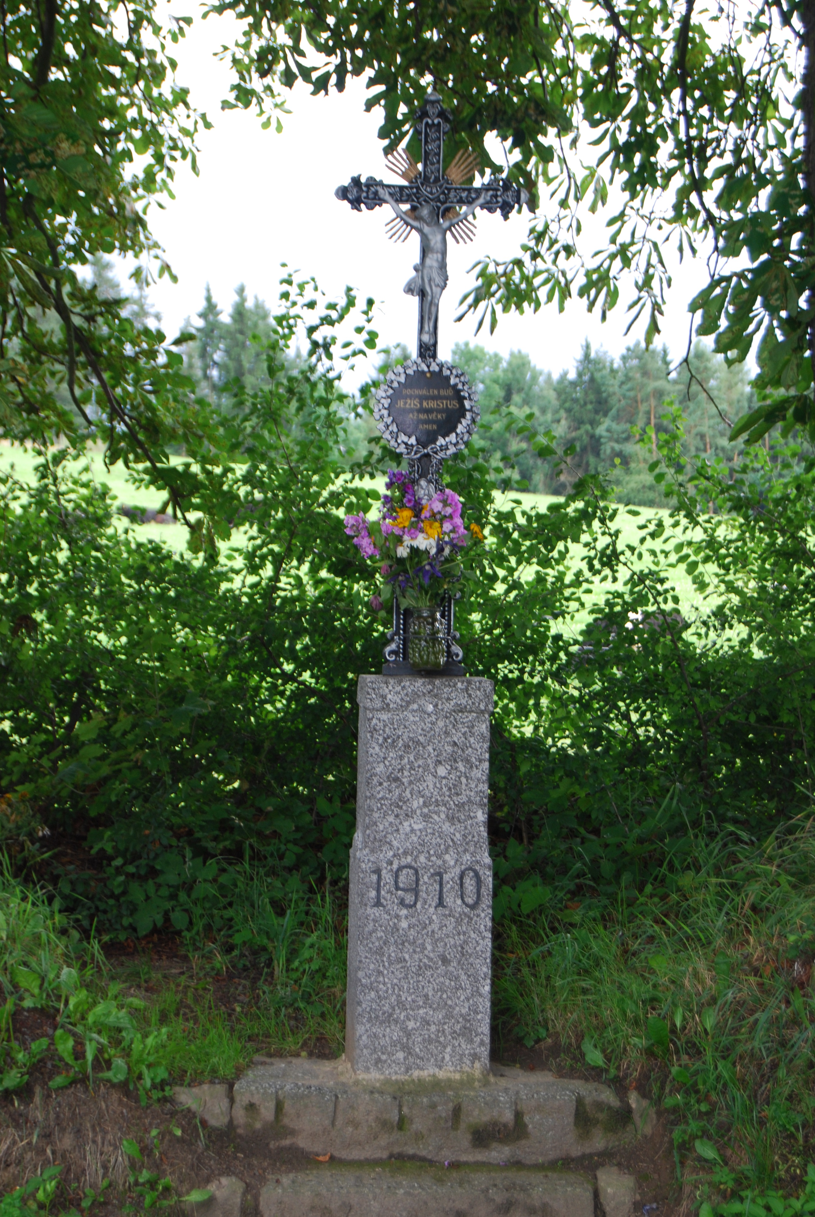 Fotografie + Čeština: Kříž za obcí nad sochou Jana Nepomuckého, u komunikace z obce ve směru na Milevsko u odbočky na Hubov. Obec Nadějkov v okrese Tábor v Jihočeském kraji. Česká republika.