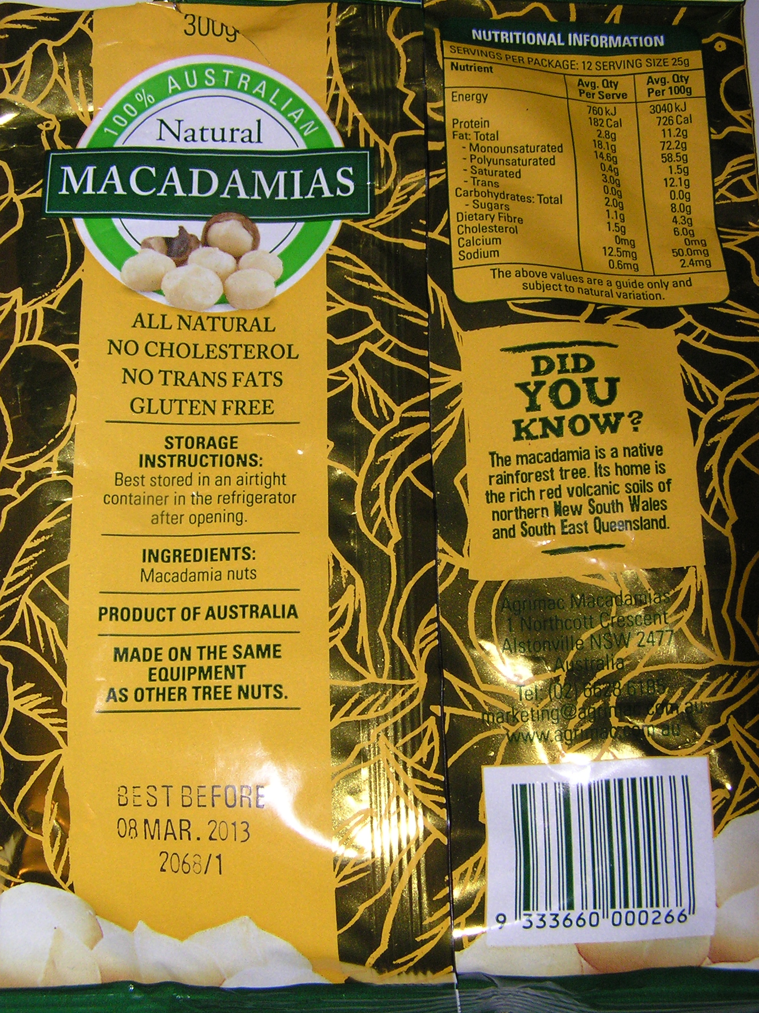 Fotografie + zadní strany obalu Australských Makadamových ořechů (300g) -- Natural Macadamias (Premium Australian), které jsem si nechal dovést z Austrálie + pochází z jednoho z mých fotoaparátů.