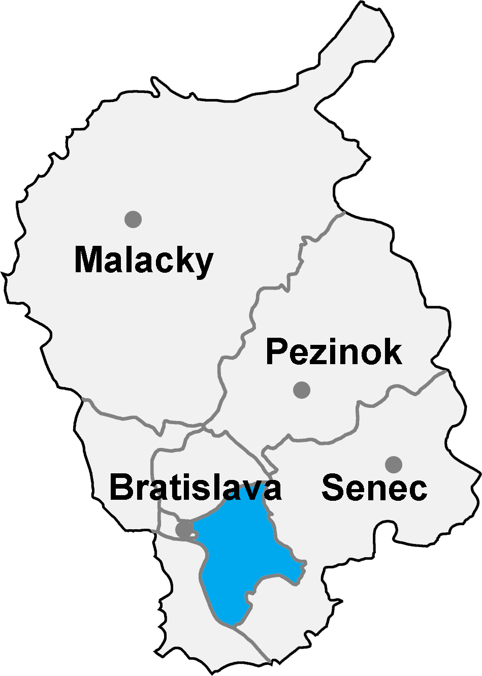 Mapa + English: map of the Bratislava region (Bratislavský kraj) in Slovakia, district (okres) of Bratislava II highlighted