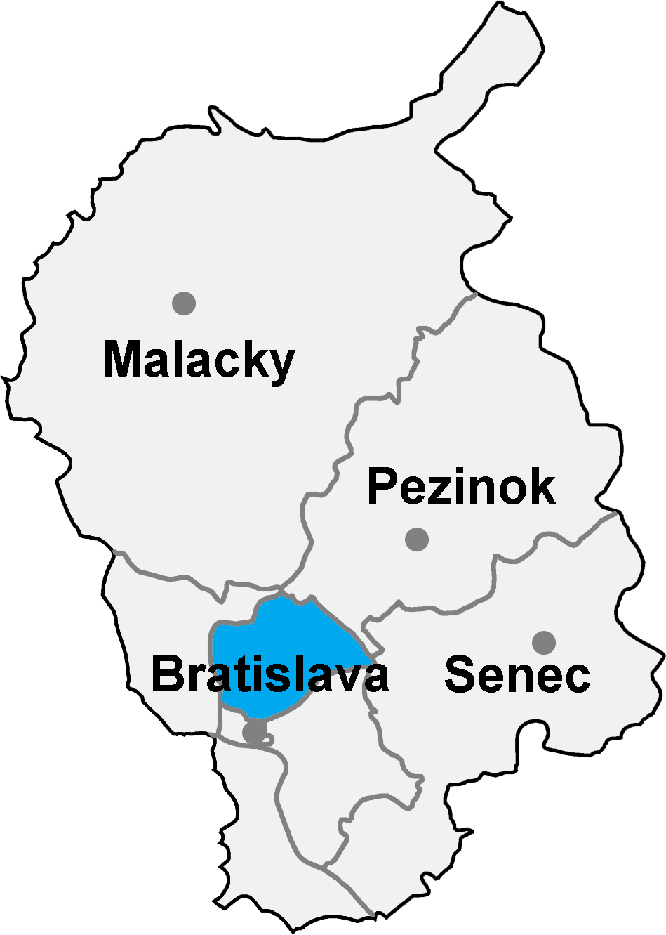 Mapa + English: map of the Bratislava region (Bratislavský kraj) in Slovakia, district (okres) of Bratislava III highlighted