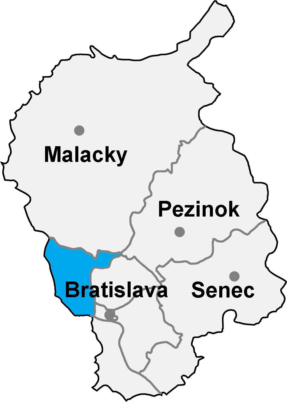 Mapa + English: map of the Bratislava region (Bratislavský kraj) in Slovakia, district (okres) of Bratislava IV highlighted