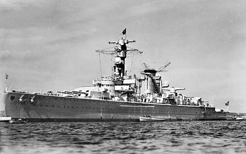 Fotografie + English: The German heavy cruiser DEUTSCHLAND (later re-named “Lützow”). One of three heavy cruisers of the Deutschland Class (sister ships ADMIRAL SCHEER and ADMIRAL GRAF SPEE). Deutschland was built by the Deutsche Werke shipyard at Kiel, being laid down on 5 February 1929. She was launched on 19 May 1931 and commissioned on 1 April 1933. Following the scuttling of the ADMIRAL GRAF SPEE in the River Plate estuary on 17 December 1939, Hitler ordered the DEUTSCHLAND to be renamed LUTZOW, to avoid the possibility of the loss of a ship bearing the symbolic name of Germany. She was scuttled on 4 May 1945 at Swinemunde after suffering heavy damage from near misses from 'Tallboy' bombs dropped by the RAF. The ship was raised by the Soviets and sunk during weapon tests in 1947.