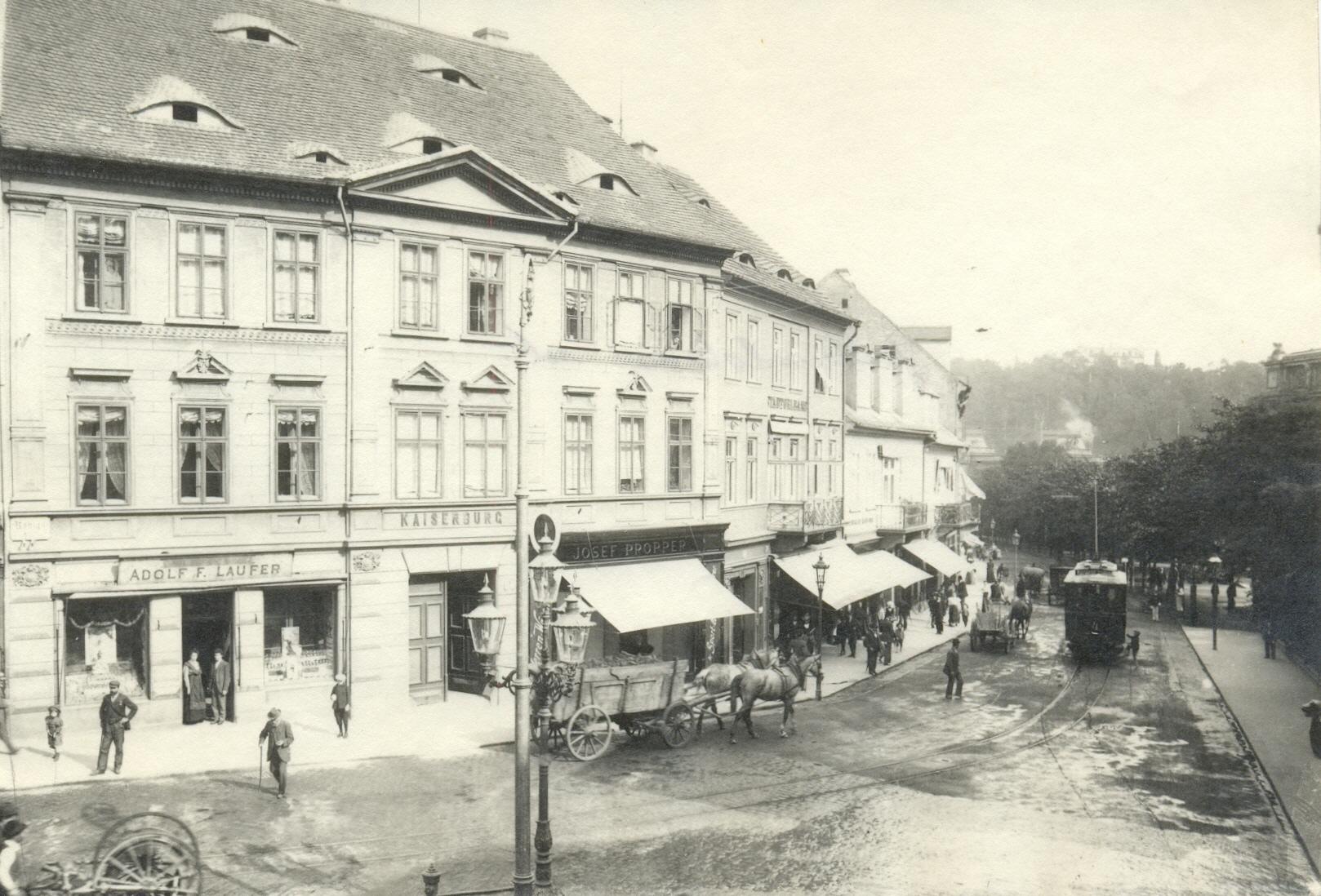 • Čeština: Pohled od dnešního divadla, přibližně kolem roku 1902