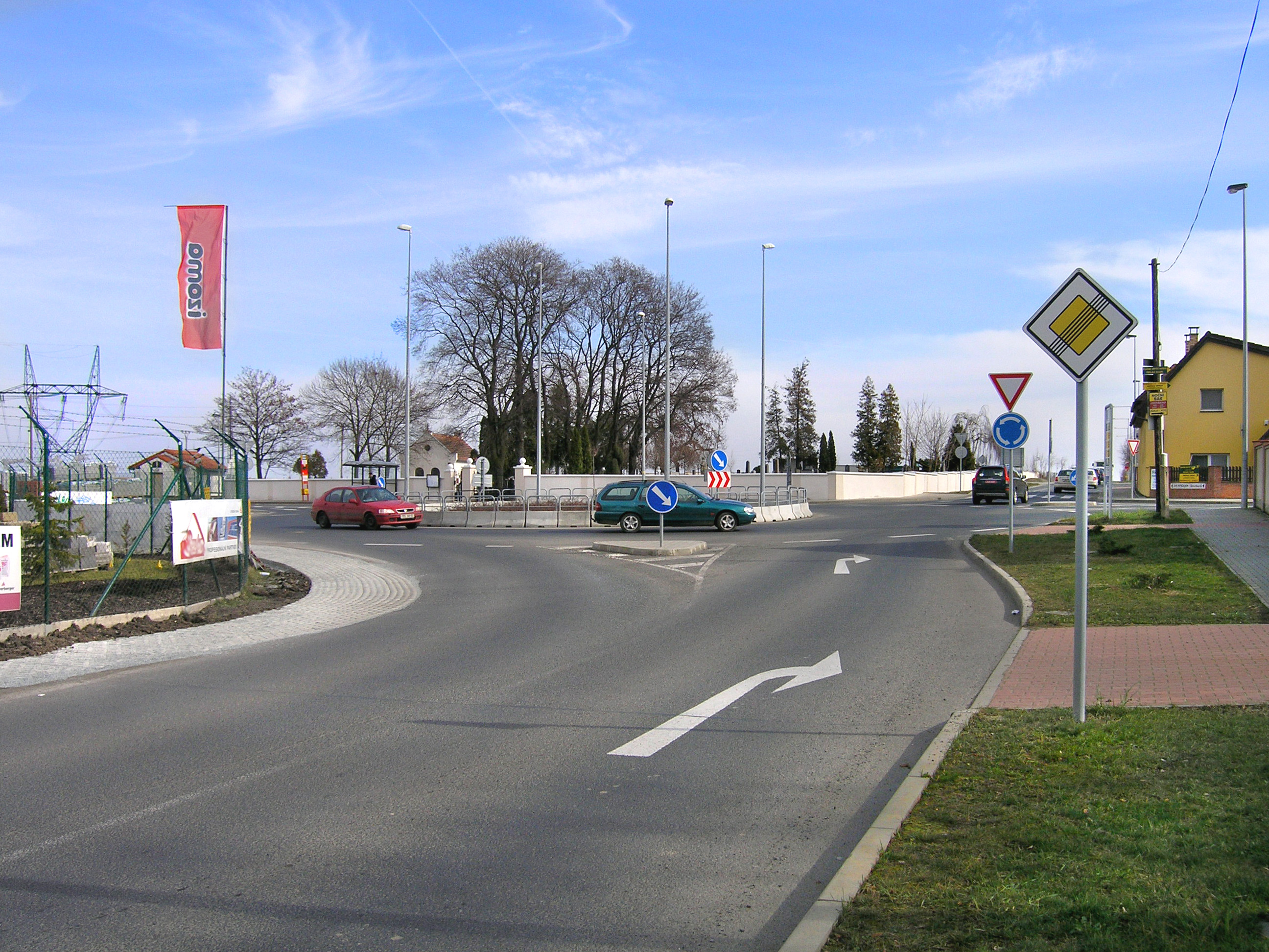 Fotografie + Čeština: Kruhový objezd v severní části Hrnčířů (Praha 11); za ním hřbitov