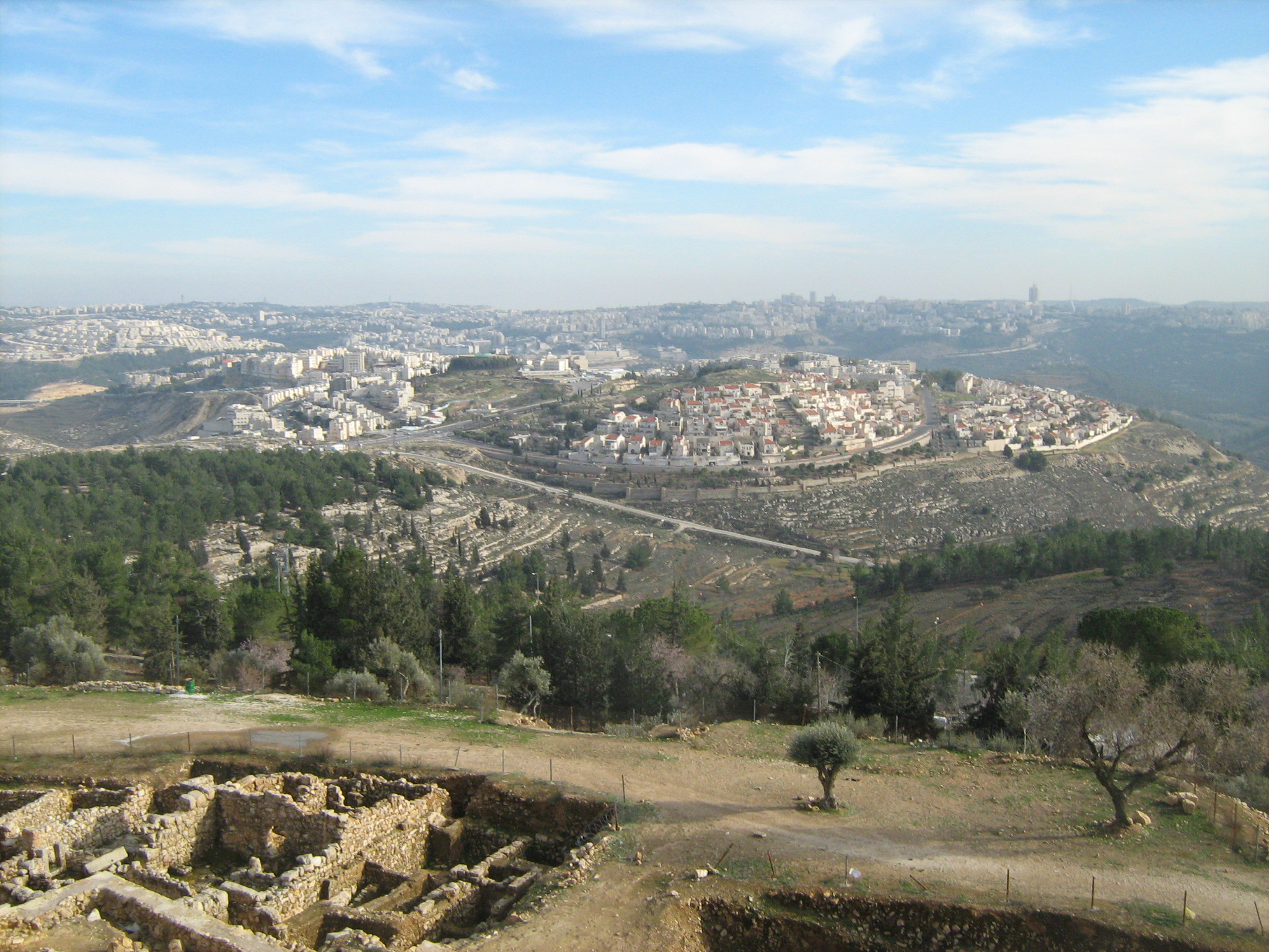 Fotografie + English: View of Ramot from the Tomb of Samuel. Part of the ruins are visible in the bottom left.
