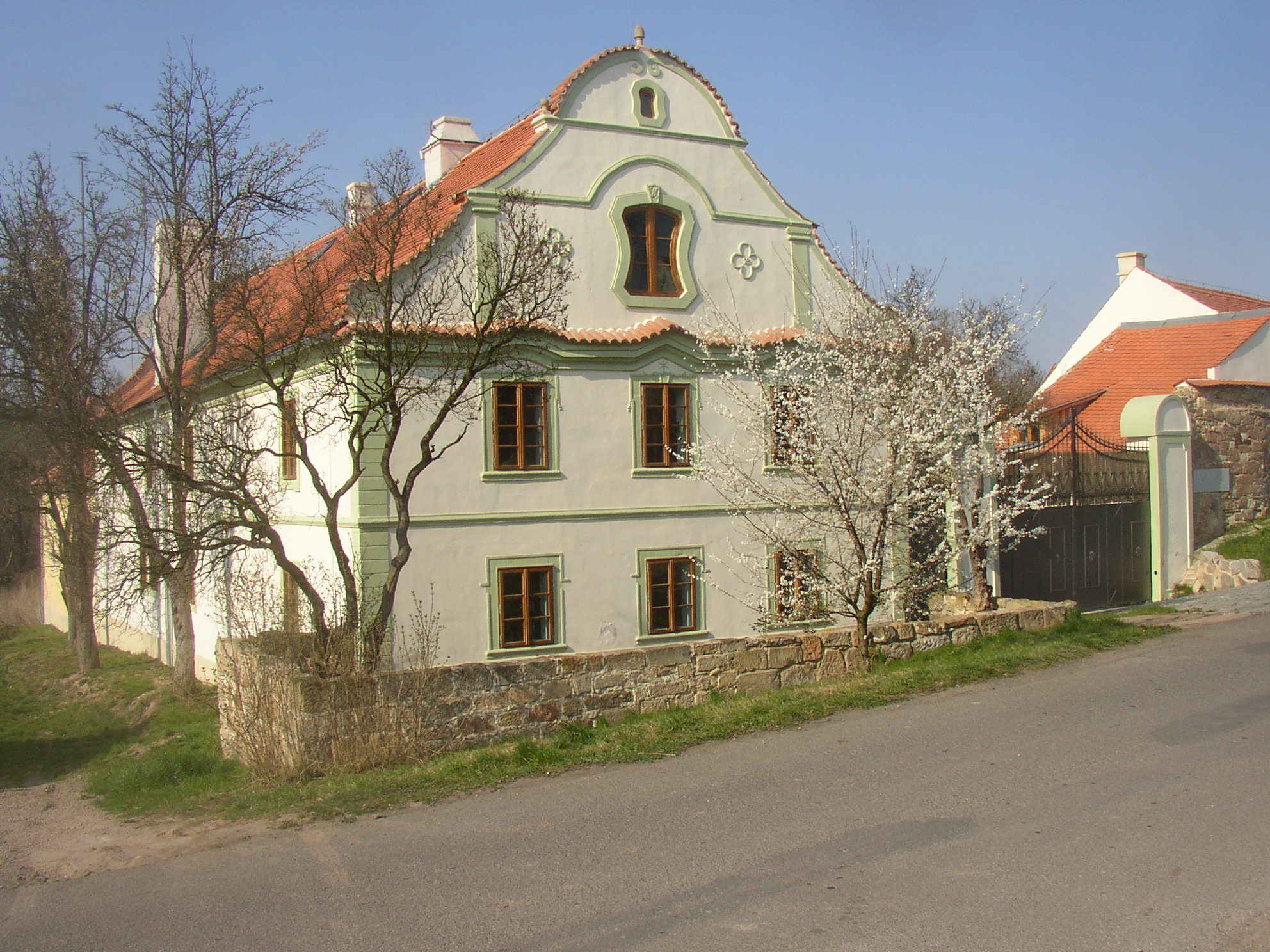 - English: Saky (a part of Třebichovice municipality), Kladno District, Czech Republic. Baroque house No 7 in northern side of the village square just after restoration.