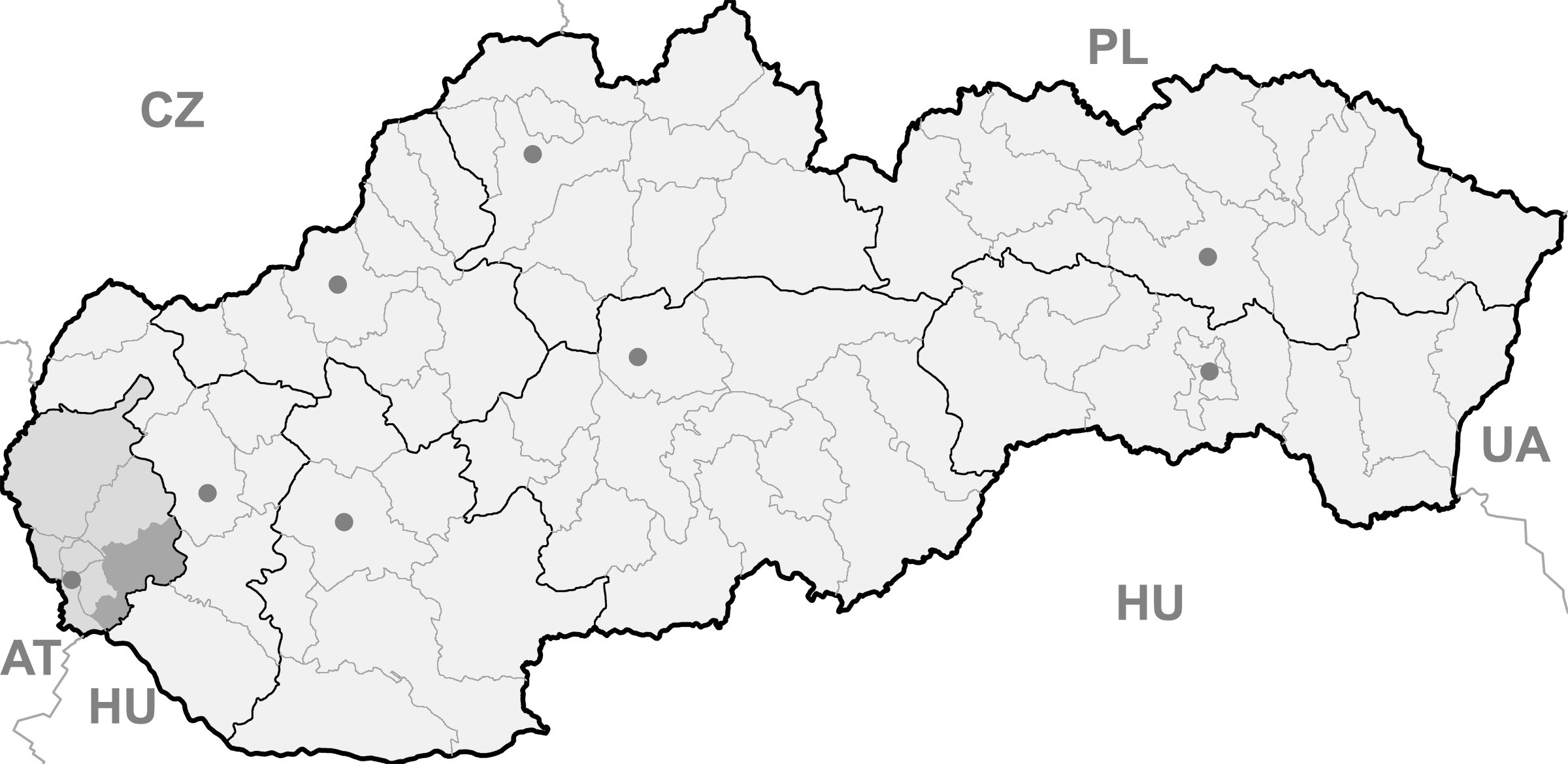 Mapa + English: Map of Slovakia, Senec district and Bratislava region highlighted