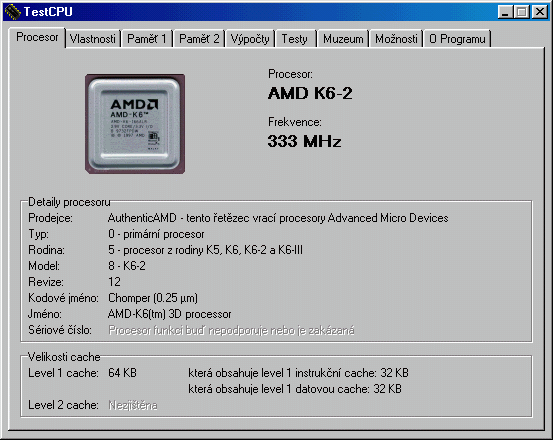 Snímek českého testovacího prográmku + TestCPU verze 0.96 s procesorem: