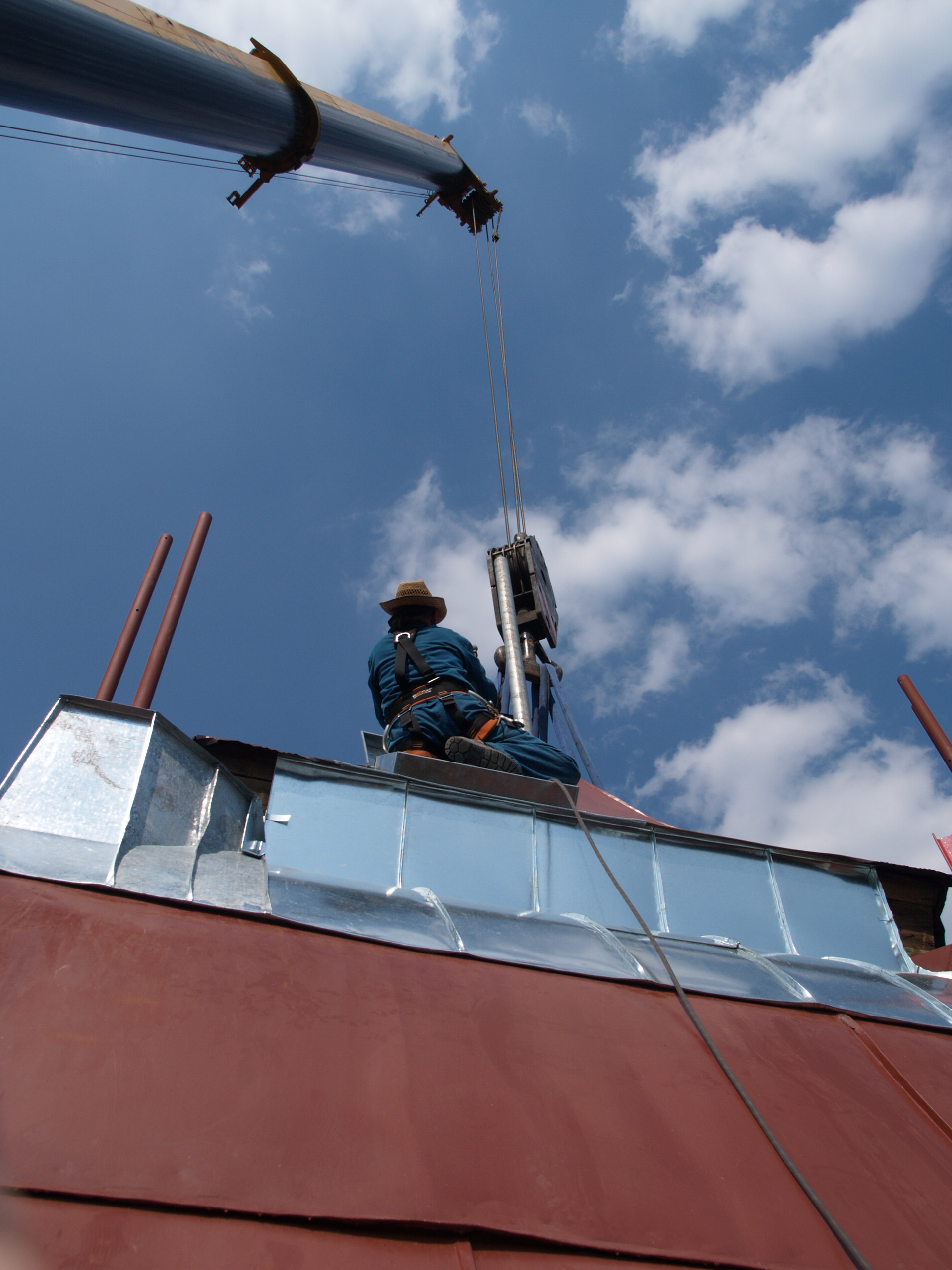 Fotografie + Čeština: Technik odvazuje střechu z popruhů jeřábu