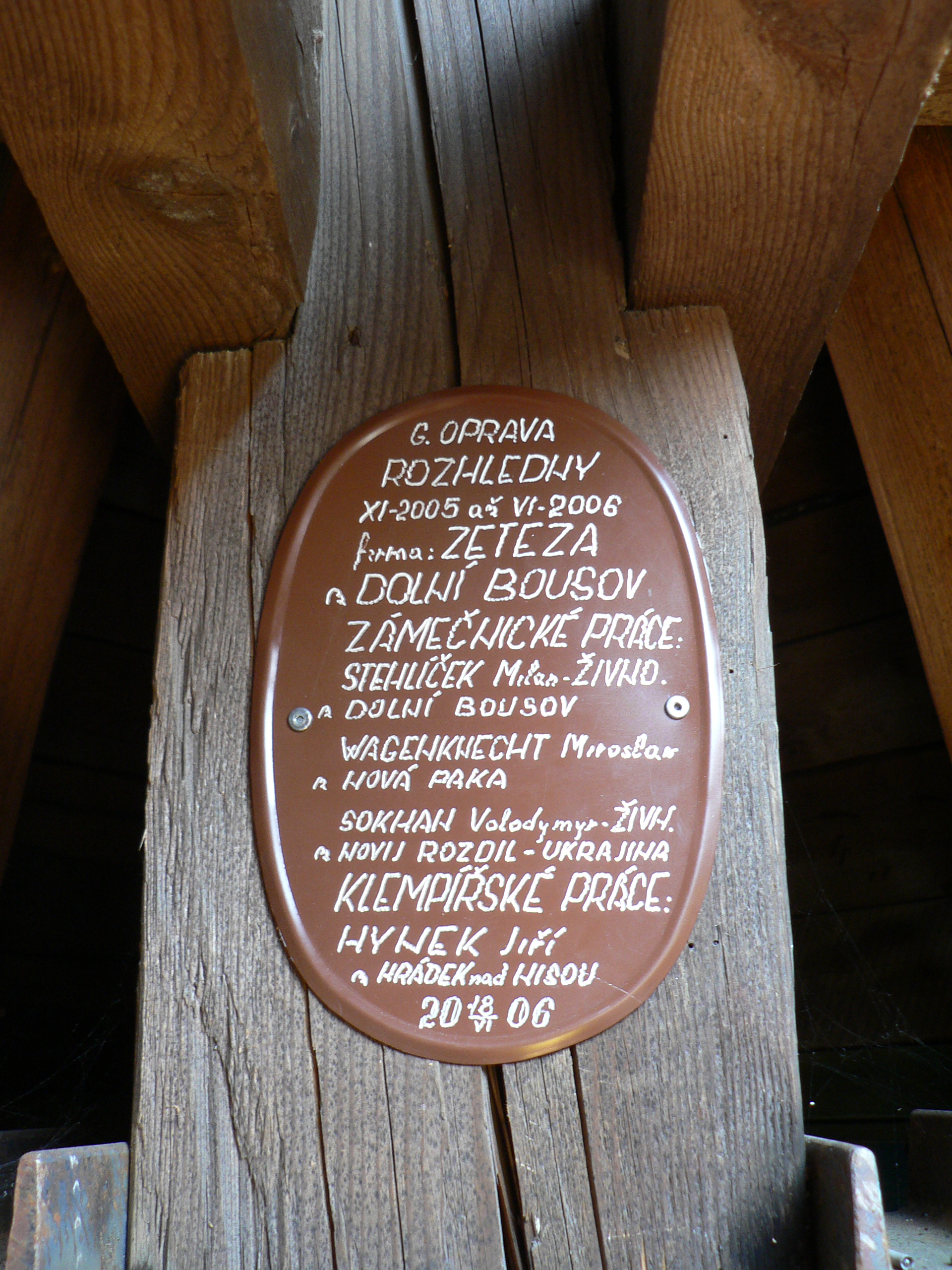 Fotografie + Čeština: Pamětní deska k rekonstrukci Tichánkovy rozhledny na vrchu Tábor u Lomnice nad Popelkou, okres Semily.