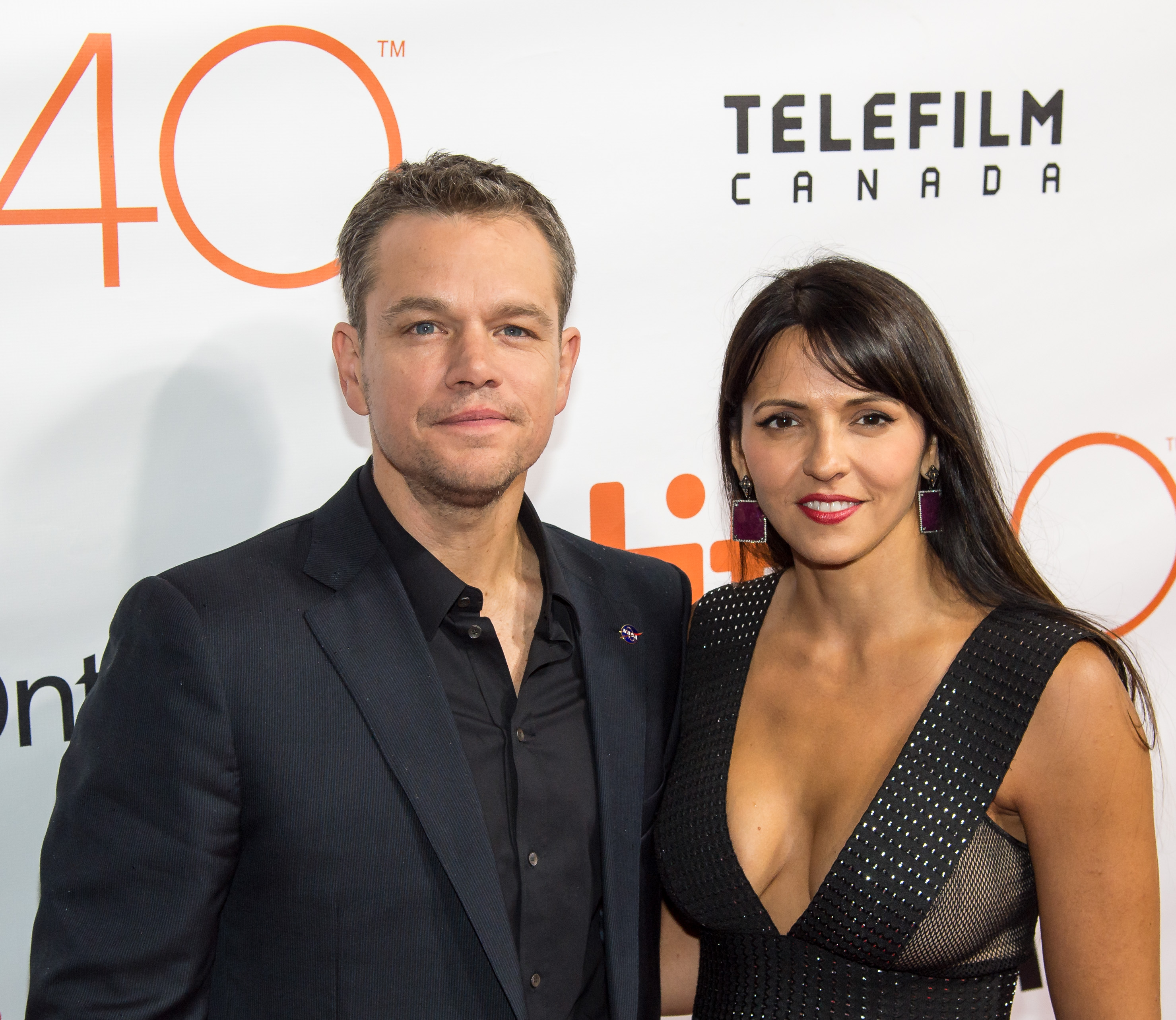 - English: Actor Matt Damon and his wife Luciana Bozán Barroso attend the world premiere for "The Martian” on day two of the Toronto International Film Festival at the Roy Thomson Hall Friday, Sept. 11, 2015 in Toronto. NASA scientists and engineers served as technical consultants on the film. The movie portrays a realistic view of the climate and topography of Mars, based on NASA data, and some of the challenges NASA faces as we prepare for human exploration of the Red Planet in the 2030s.