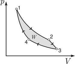 - tepelné motory, ve kterých se přeměňuje teplo dodávané ze zásobníku s vyšší teplotou na práci při vzniku zůstatkového tepla, které je potřeba dovést do zásobníku s nižší teplotou. Pracovní cyklus takového stroje v p-V diagramu probíhá ve směru hodinových ručiček.