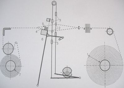 Na vedlejším náčrtu je schematicky znázorněno zhotovení tkaniny: Osnova se odvíjí z osnovního válu (1), jednotlivé niti procházejí nitěnkami (drátěnymi očky 2), které jsou zavěšeny na listu (3). Soustava listů tvoří tzv.brdo, jehož úkolem je zdvihat jednotlivé listy a vytvořit tak prošlup (4), kterým prochází zanašeč útku (5). Osnovní niti jsou dále vedeny paprskem (6) který udržuje osnovu v patřičné šíři a přirazí každý zanešený útek k hotové části tkaniny. Tato se navíjí na zbožový válec (7).