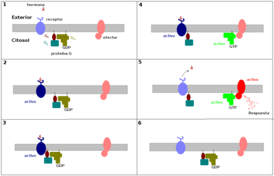 G proteiny jsou rodinou GTPáz fungujících jako druzí poslové ve vnitrobuněčné signalizaci. Existují u nich dvě konformace: „zapnutá“, jsou-li navázány ke GTP, a „vypnutá“, mají-li navázán GDP. Přepínání mezi těmito stavy je zprostředkováno GEF (guanine nucleotide–exchange factor), proteiny, které katalyzují disociaci GDP z G proteinu; k vazbě GTP pak dochází samovolně v důsledku jeho vyšší koncentrace v cytoplazmě. Změna konformace vyvolaná vazbou GTP umožňuje G proteinu aktivovat další proteiny buněčných signálních kaskád. Rychlost hydrolýzy GTP závisí mj. na aktivitě GAP (GTPase-accelerating protein) proteinů, které mohou také reagovat na extracelulární signály.[1]