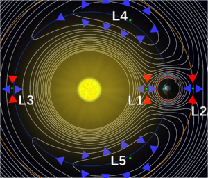 Znázornění Lagrangeových bodů pro planetu, kolem níž obíhá jeden měsíc. Body L1 a L2 leží na hranici Hillovy sféry.