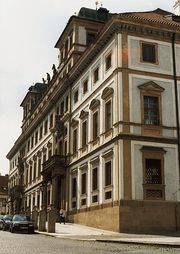 Toskánský palác od J. B. Matheye v Praze: lizénové rámy jsou bílé, zatímco ostatní architektonické články okrové a základní plocha světle modrá.