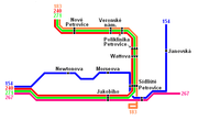 Schéma dopravní obsluhy Petrovic MHD. Od 14. prosince 2008 je přes zastávku Sídliště Petrovice (ve stopě linky 267) veden také svazek příměstských linek směrem od Říčan a Uhříněvsi.
