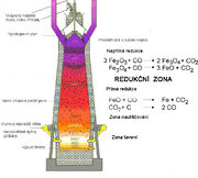 V nižších pásmech pece dále stoupá teplota a dochází zde při teplotách mezi 1 000 a 2 000 °C jak k přímé redukci ještě neredukovaných oxidů železa z již těstovitého až tekutého kovu uhlíkem, tak i k nauhličování taveniny. V surovém železe se obsah uhlíku pohybuje v rozmezí 3,5 až 4,5 % (sloučeniny železa z uhlíkem se dělí podle množství uhlíku a teploty, při které vznikají: např. austenit, cementit, perlit, ledeburit, ferit), viz diagram Fe-C Přímá redukce: